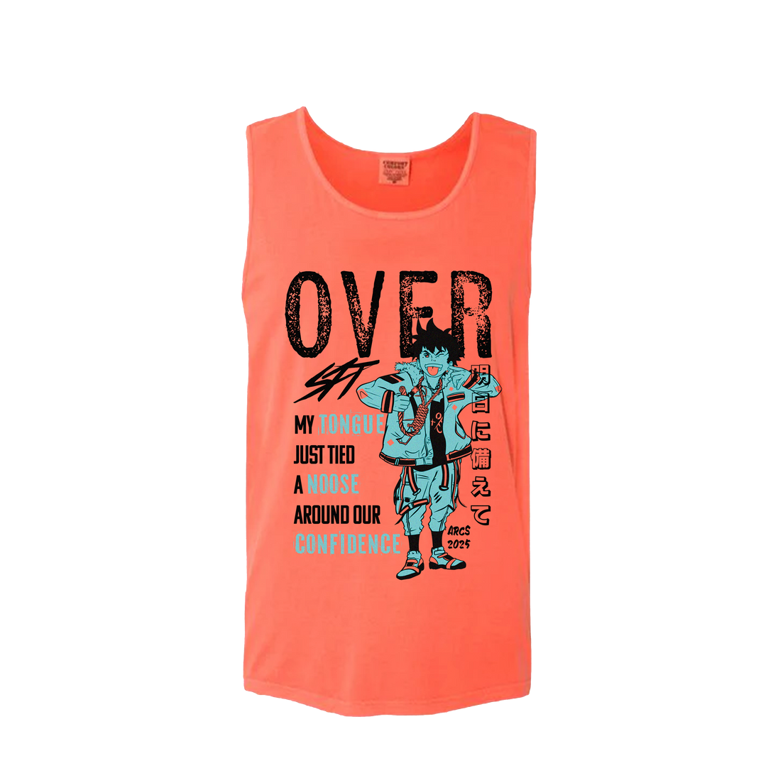 Salmon colored comfort colors tank top featuring original artwork done by Muse Haven Co (Eyker Cruz) inspired from our song "Over"